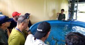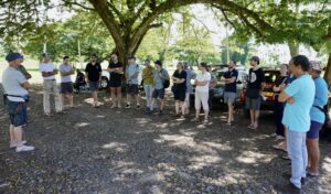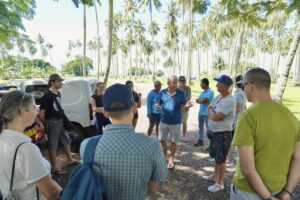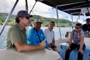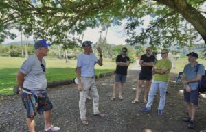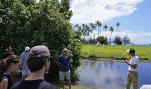 Après un accueil chaleureux sur le site par Clément Vergnhes, Adjoint au maire de la commune de Teva I Uta, Justin Feig, Aménageur à la DAF, a présenté l’historique du lieu ainsi que ses caractéristiques géographiques, humaines et naturelles. Dans la lignée explicative du site, les représentants des pêcheurs du rāhui de Paparā et de l’A.M.E de Vahoata ont introduit leurs activités. Cela a permis aux membres académiques présents d’imaginer comment les associer dans les futures actions du living lab. Cette présentation a été enrichie par les connaissances écologiques du site apportées par Jean-Yves Meyer, Écologue terrestre à l’UMR SECOPOL. À l’issue des explications, Jean-Yves Meyer a présenté les berges de la rivière Mo’aroa à restaurer, ainsi que leur biodiversité associée, et une zone humide à protéger et réhabiliter pour préserver l’ensemble des services écosystémiques qu’elle offre.
