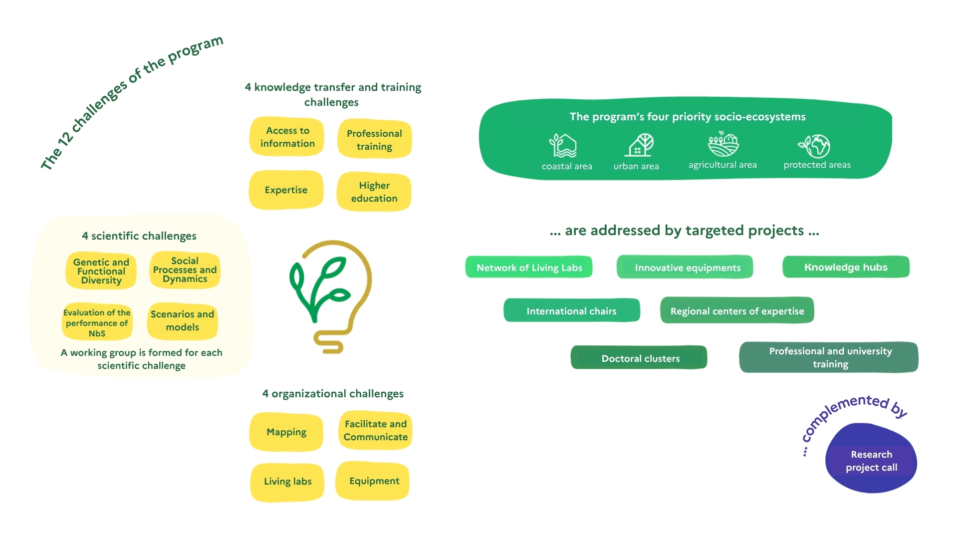 France hosts high-level research on biodiversity but lacks a well-structured research community to tackle the challenges of NbS. The national research program therefore aims to promote the development of innovative and ambitious research on NbS as systemic approaches.