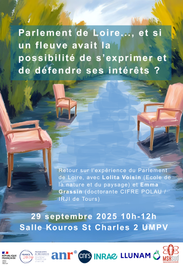 Ce séminaire, organisé par l’équipe du living lab LLUNAM (PNR SoluBiod), sera l’occasion d’en apprendre plus sur le projet « Parlement de Loire », ses origines, ses objectifs, sa méthodologie, ses produits, mais aussi ses limites. Comment faire société autour d’un projet de ce type ? Comment porter la voix des non-humains ? Comment passer de la fiction juridique à l’opérationnalisation de la démarche ? En quoi ce type de démarches transforment-elles les stratégies et les projets menés localement ou nationalement ?