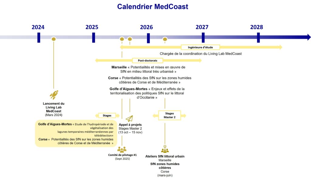 Le living lab MedCoast étudie les Solutions fondées sur la Nature (SfN) appliquées au littoral méditerranéen, notamment du golfe d’Aigues-Mortes en Occitanie, de Marseille, du Golfe de Giens et de la rade de Hyères et de la plaine orientale de Corse.