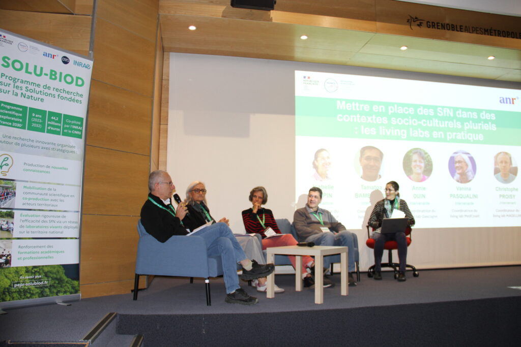 L’après-midi a été consacré à un cycle de tables rondes autour des living labs du réseau SOLU-BIOD, introduit par Dominique Joly. La première table ronde, animée par Joana Guerrin, a mis à l’honneur le rôle des living labs comme espaces d’expérimentation des Solutions fondées sur la Nature, grâce aux retours de Sandra Lavorel (VIVALP), Julien Mary (LLUNAM), Coralie Pauchet (Ponant) et Aurélie Vincent (Bacchus).